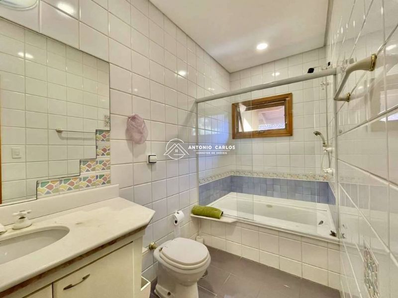 Banheiros com espelho, gabinetes, box de vidro e banheiras. Sendo a master com grande espelho, tampo de mármore, 2 cubas e hidro.
