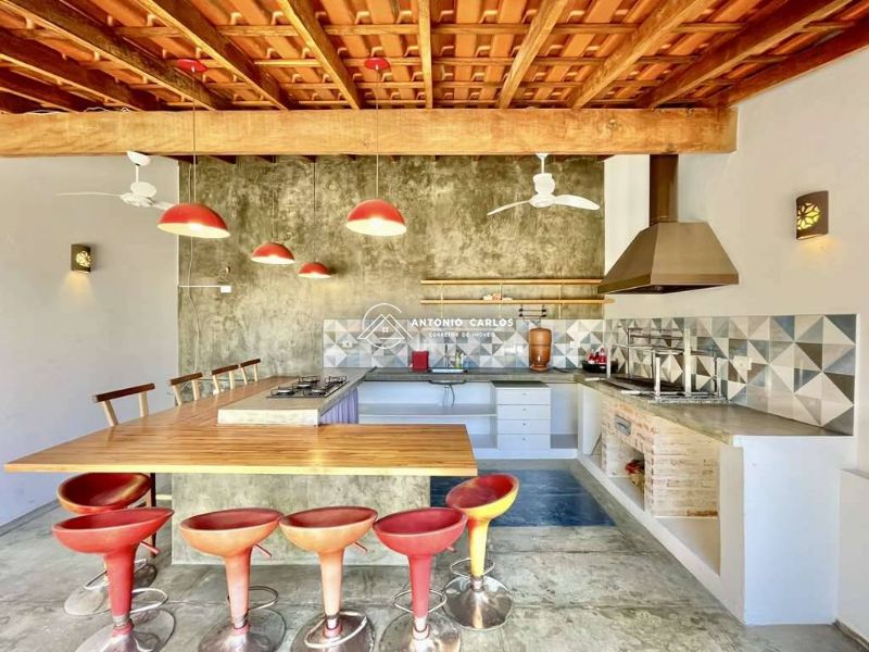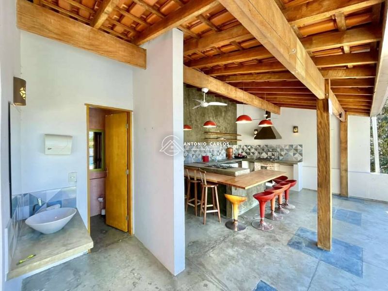 Anexo gourmet com churrasqueira, coifa, bancada, pia inox, grande balcão para 8 lugares e lavabo com lavatório externo.