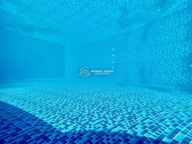 Piscina 9m x 6m em vinil, iluminada, com prainha, solarium, depósito e casa de máquinas.