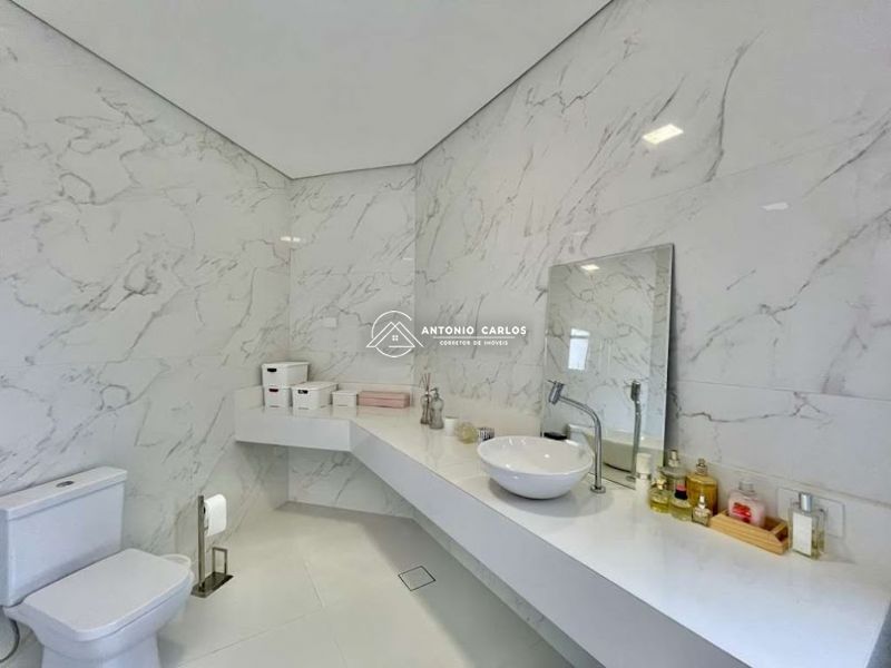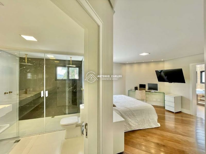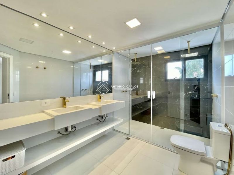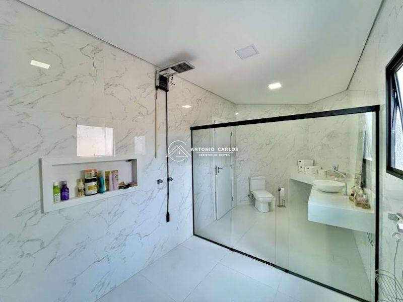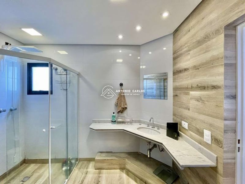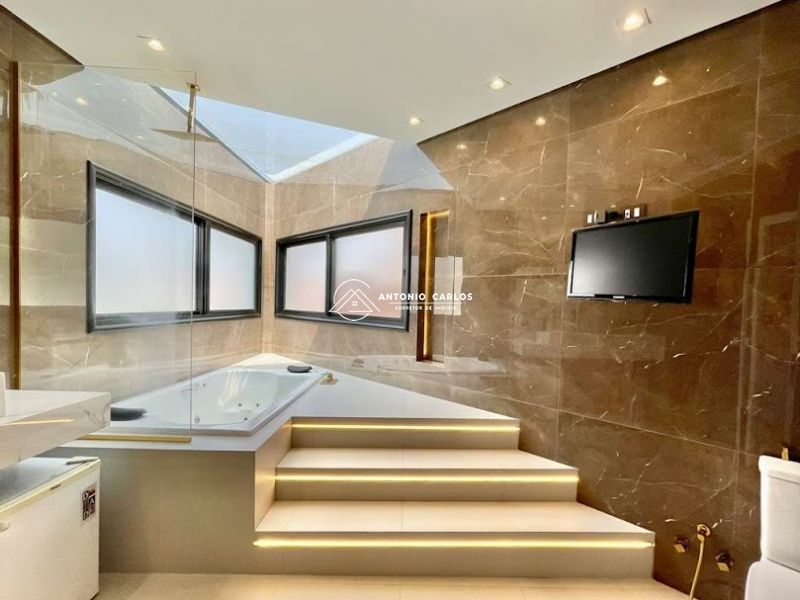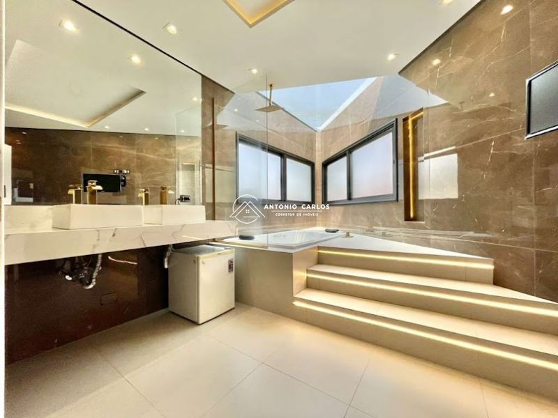 Banheiros com espelho, box de vidro e nichos, sendo a master principal com 2 banheiros sr. e sra., um deles com ducha de teto, 2 cubas, hidro dupla, teto de vidro e televisão. A outra master com espaço para hidro.