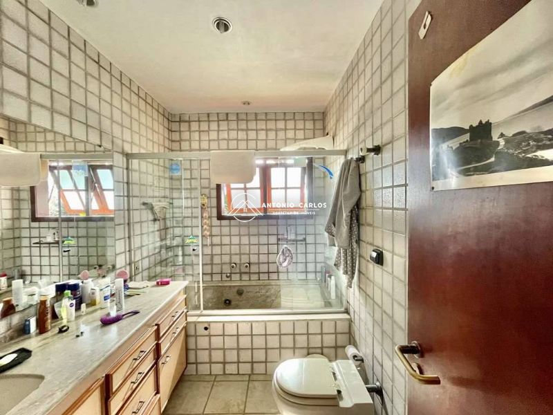 Banheiros com tampos em mármore, gabinetes, espelhos, box de vidro e jardinzinho, sendo a máster com hidro.