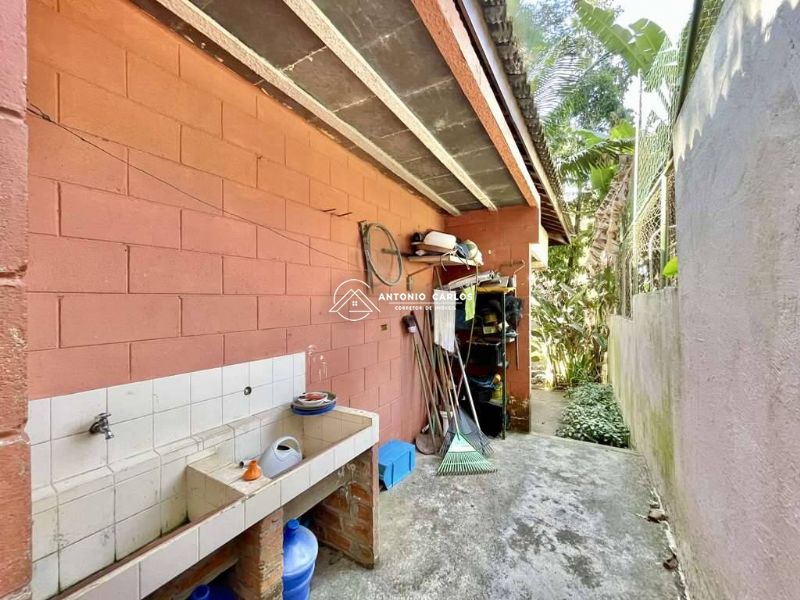 Área de serviço aberta ensolarada e lavanderia fechada com 2 tanques e armários.