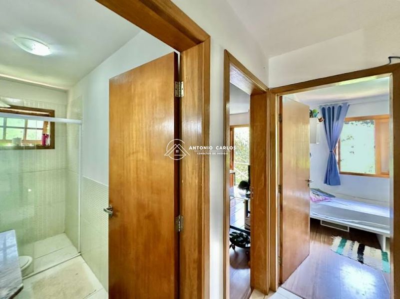 Portas e janelas em madeira e vidro, com veneziana nos quartos.