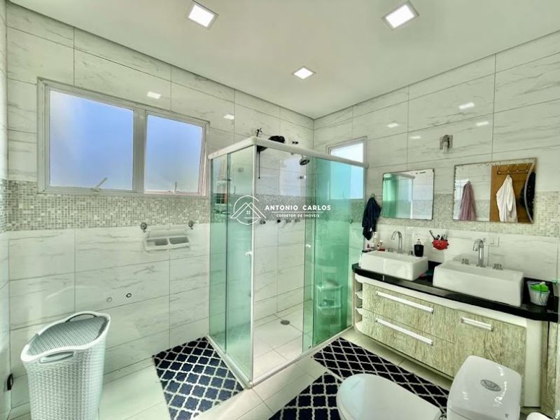Banheiros com bancadas em Travertino, espelhos, gabinetes e box de vidro. Sendo a master com 2 cubas, 2 duchas e preparada para Hidro.
