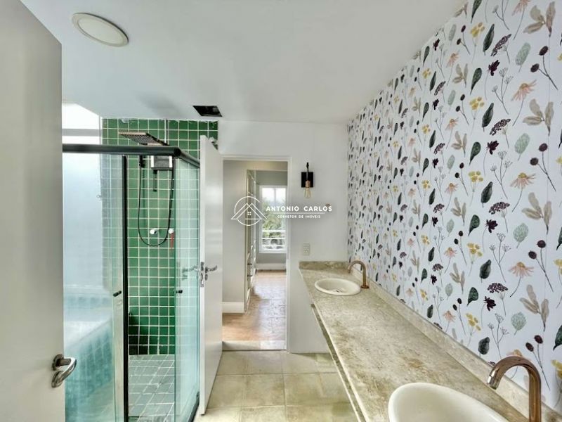 Banheiros com tampos em mármore e a master com 2 cubas e hidro.
