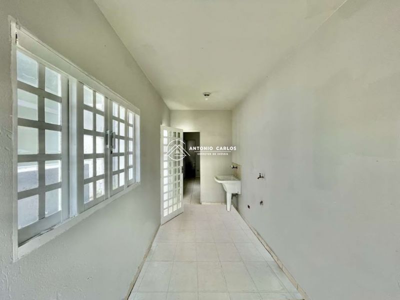 Área de serviço aberta ensolarada e lavanderia fechada com tanque e dependências de serviço (quarto e banheiro).
