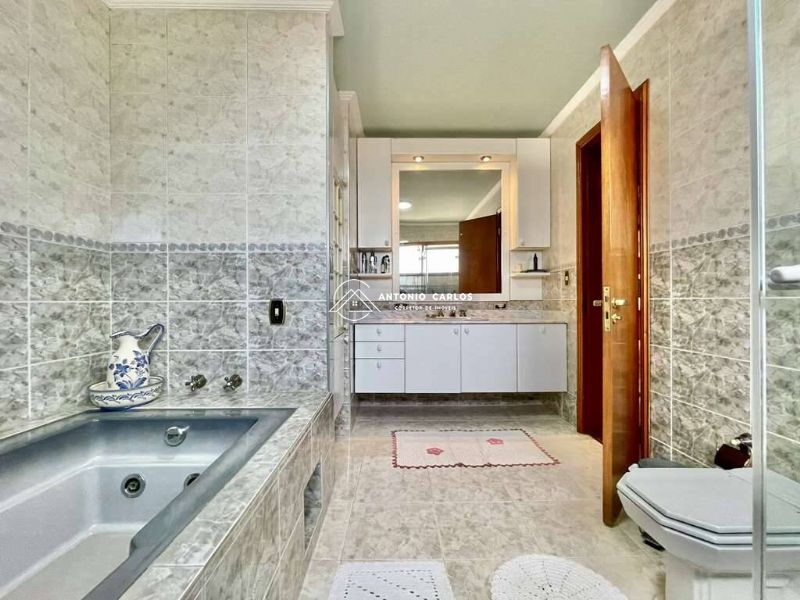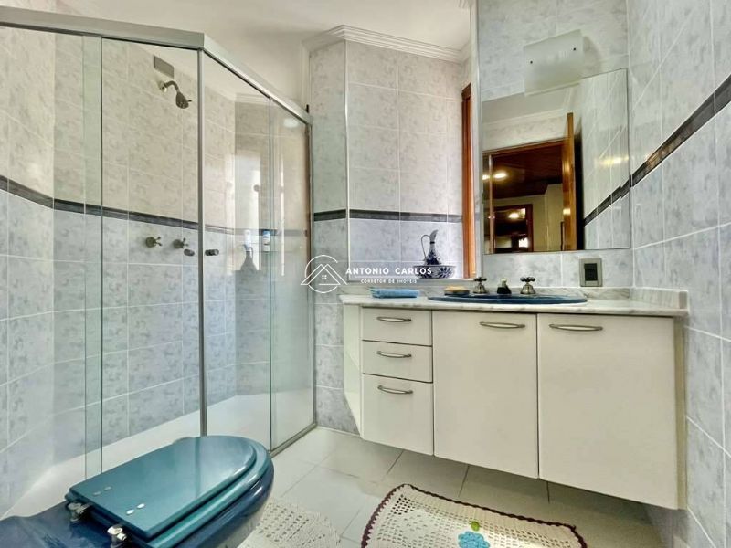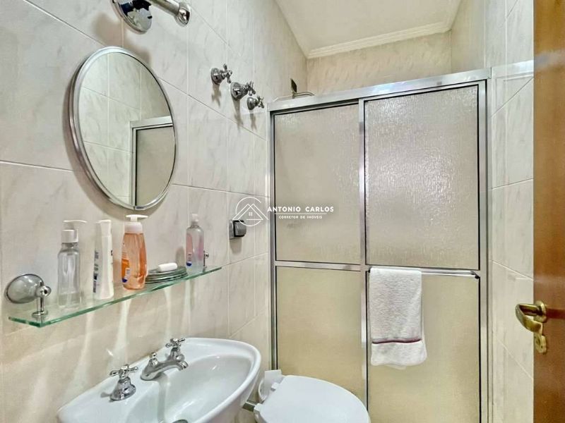 Banheiros com espelho, bancada em mármore, armário, gabinetes e box de vidro, sendo a master com hidro.