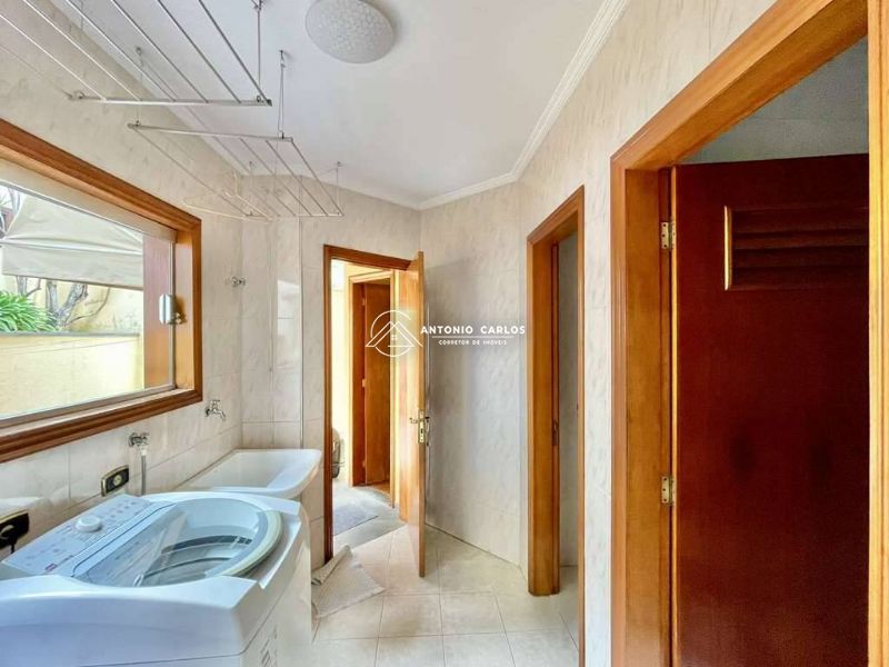 Área de serviço aberta ensolarada e lavanderia fechada com despensa, tanque e banheiro.