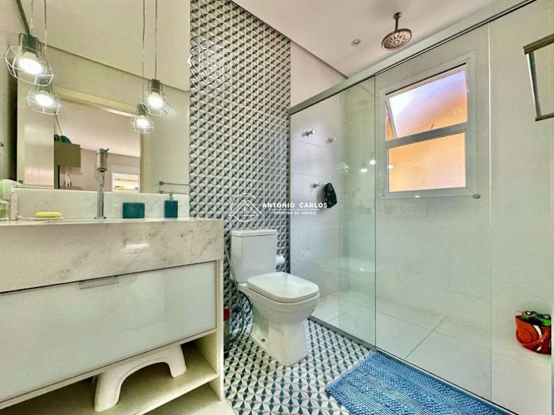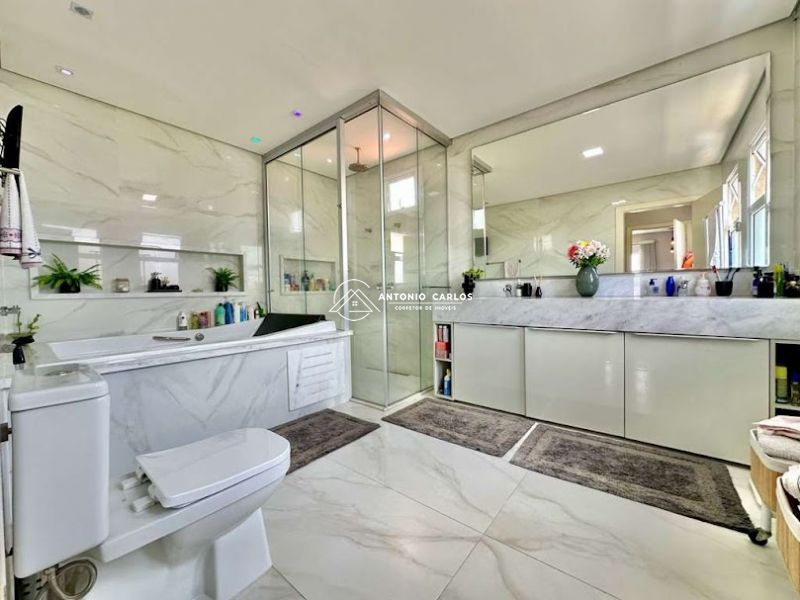 Banheiros planejados com tampos em mármore, gabinetes, espelhos, box de vidro até o teto com nichos. Sendo a máster com 2 cubas, hidro dupla, chuveiro de teto.